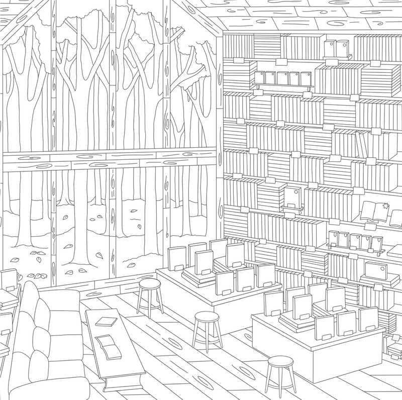46 scènes à colorier pour voyager au coeur de bibliothèques et de salons de lecture chaleureux venus d’ailleurs, le temps d’un moment d’évasion.