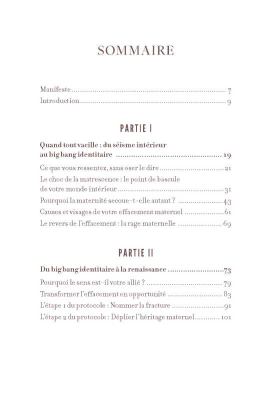 Dans ce livre intime et engagé, Émilie Briand, thérapeute spécialisée dans les transformations identitaires, met des mots sur l’effacement maternel et sur ce qu’il coûte aux femmes. Elle propose un chemin de reconnexion à soi en huit étapes pour retrouver son identité, clarifier ses besoins et réhabiliter ses désirs.