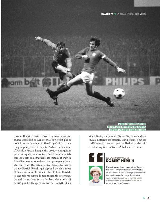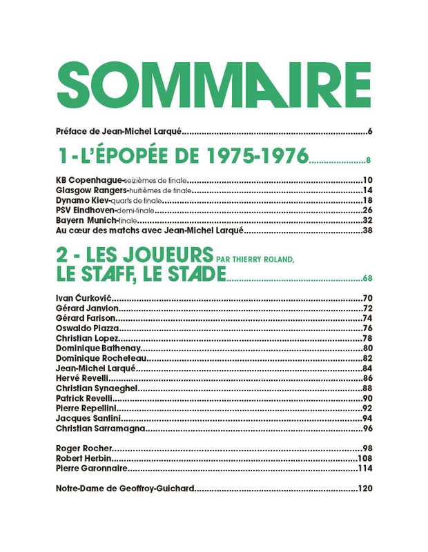 Reporters passionnés présents tout au long de l’aventure verte, Dominique Grimault et Patrick Mahé ont recueilli les commentaires de Robert Herbin, le captivant témoignage de Jean-Michel Larqué, la sélection des joueurs de Thierry Roland et le cri du coeur de Michel Drucker.