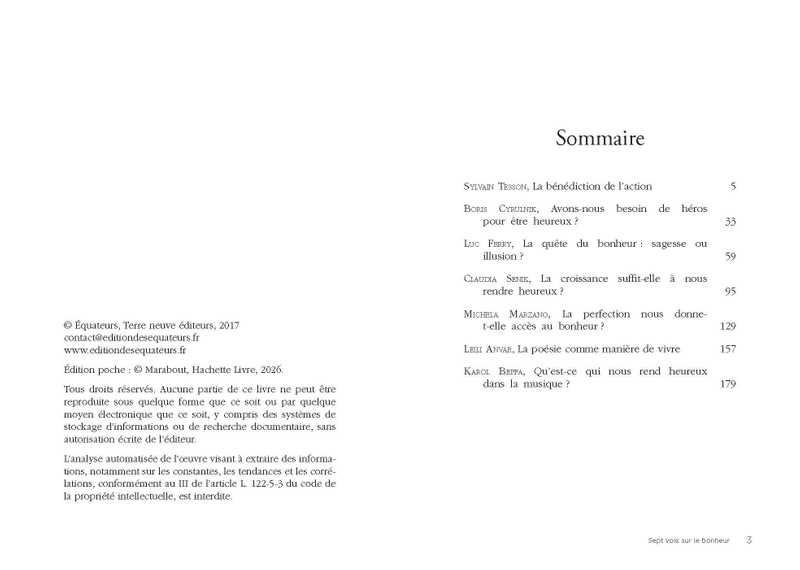 Neuropsychiatre, philosophes, écrivains, économiste, musicienne… Sept experts en leur domaine s'interrogent sur le bonheur, la joie, « la vie bonne », l'épanouissement, le sens de la vie.